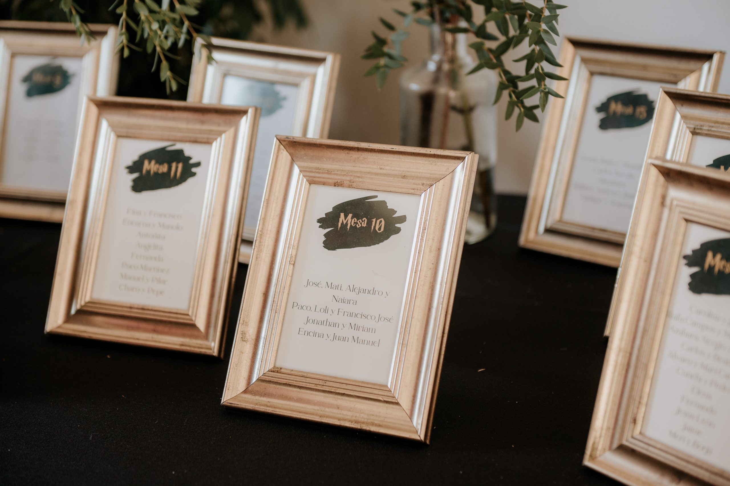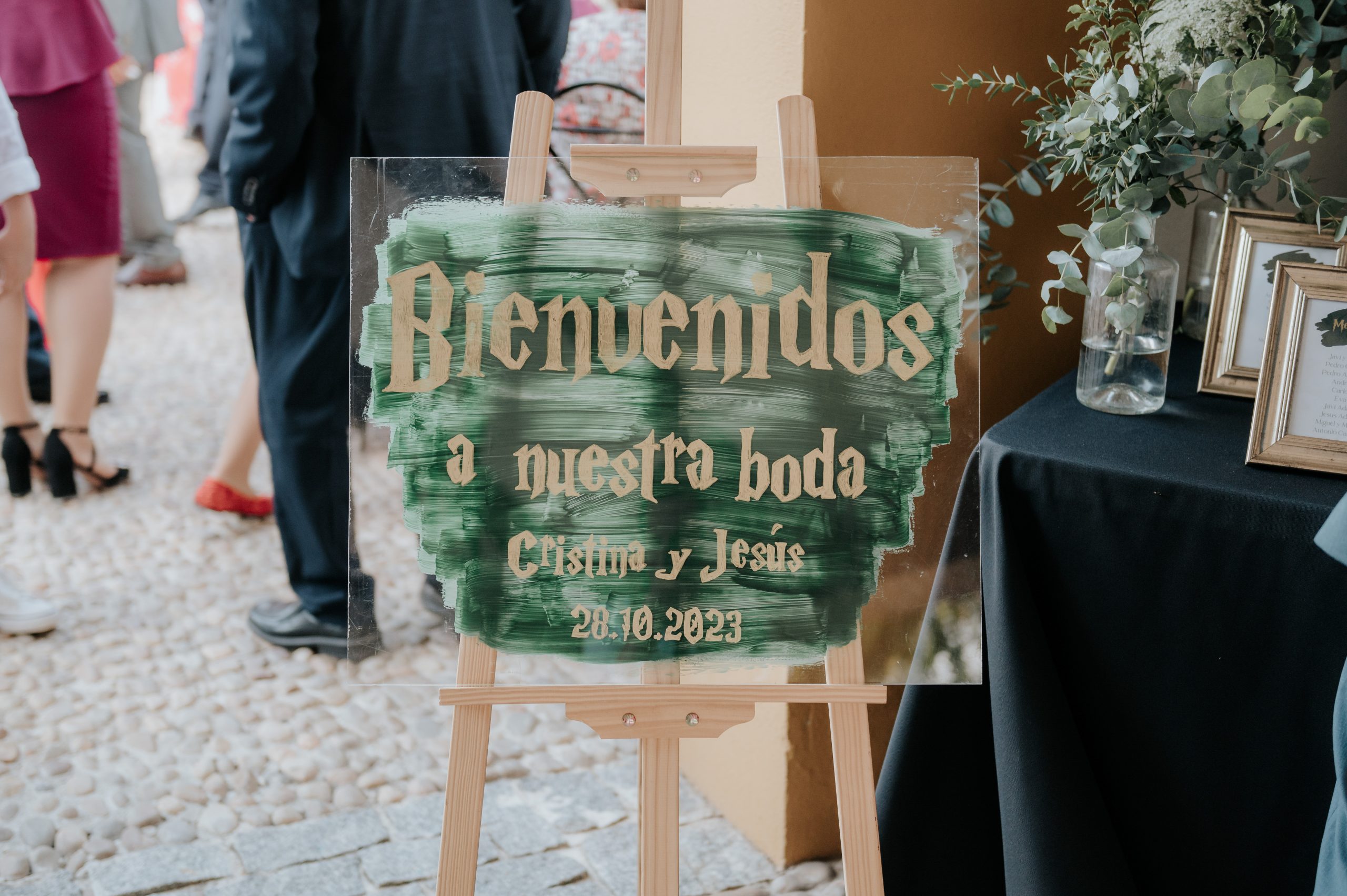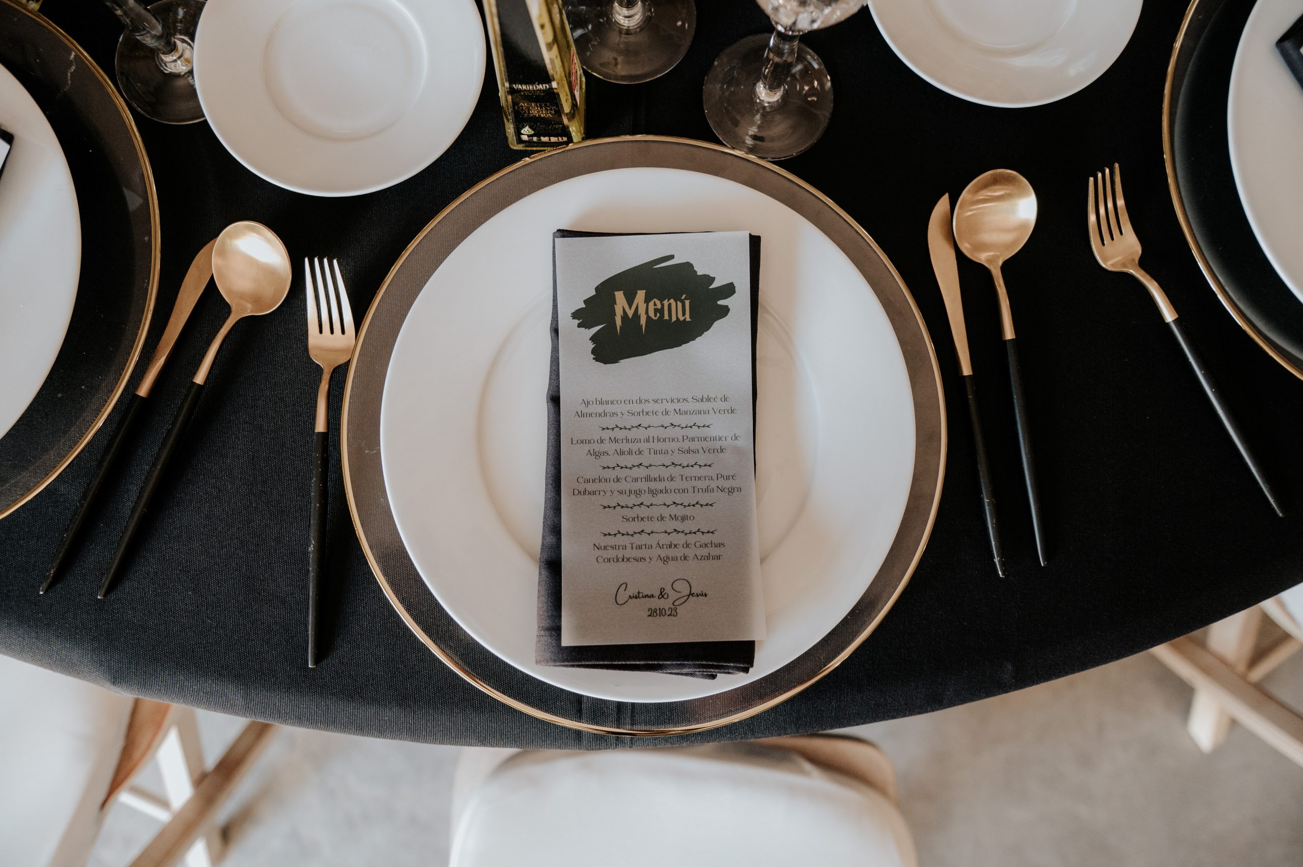 Para Cristina & Jesús el reto fue convertir el universo de Harry Potter en una boda única: primero me sumergí en maratones de la saga junto a Sofía y su papá para absorber cada detalle mágico; luego, trasladamos la paleta otoñal de Hogwarts (verde esmeralda, burdeos, negro y oro) a un diseño elegante de octubre usando metacrilato y papel cebolla. Con manteles y ramo en negro profundo y la novia luciendo una chaqueta de cuero, logramos un ambiente audaz y sofisticado donde la esencia de Hogwarts se sintió en cada rincón—todo mientras los novios disfrutaban de su gran día sin perder ni un ápice de magia.